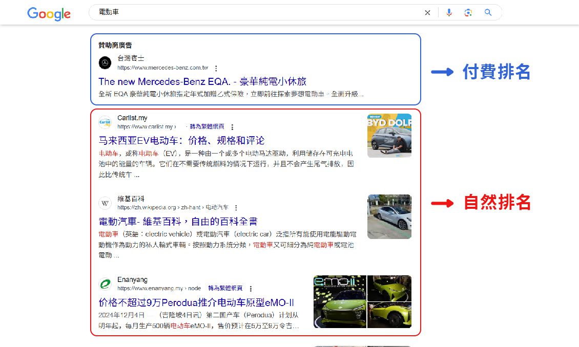 • 付費排名:搜尋「電動車」,會看到「贊助商廣告」標記的結果。