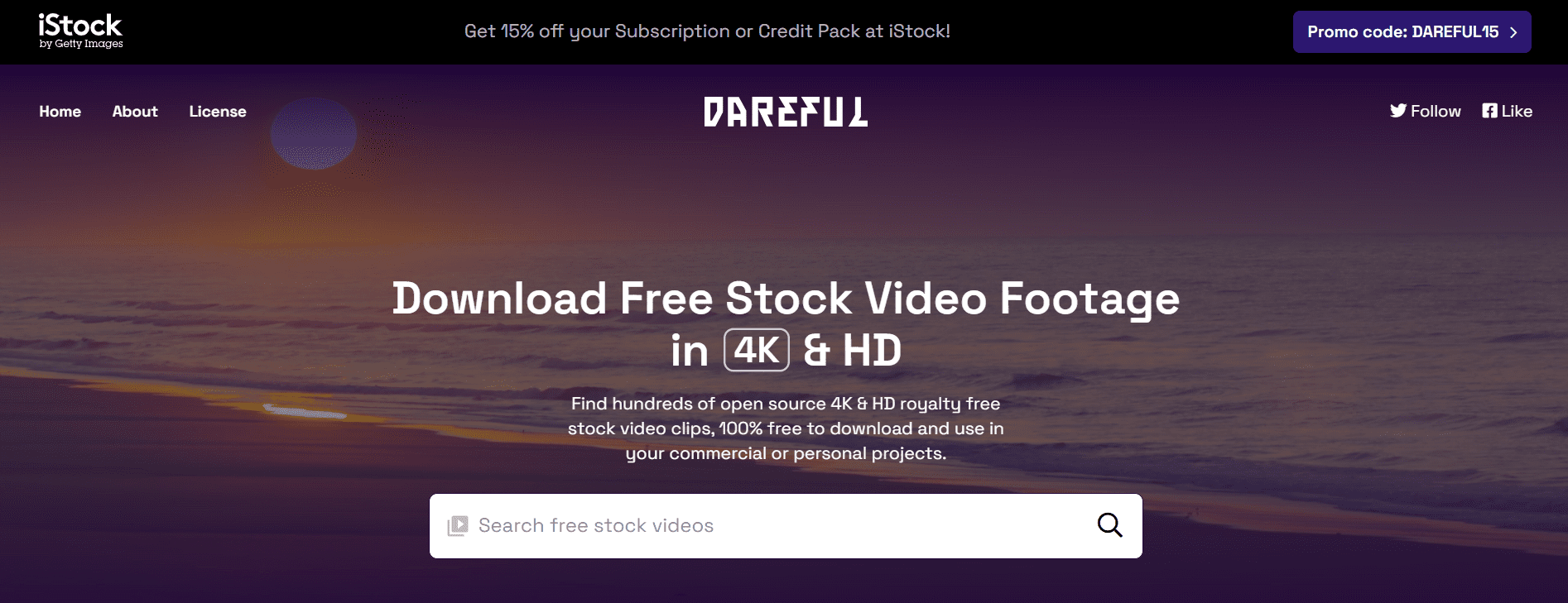 Dareful提供完全免費的4K高解析度影片,所有影片都可以商用,這使其成為尋找高質量影片素材的絕佳選擇。Dareful的特色在於其精選的高質素內容,尤其是自然和戶外相關的影片。