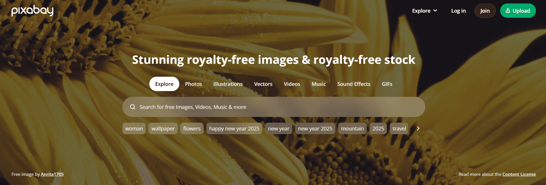 Pixabay提供超過一百萬張的高品質照片、矢量圖、插圖和視頻,所有素材均遵循CC0授權,使用者無需署名便可自由用於商業和非商業用途。